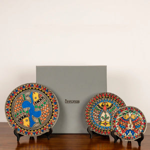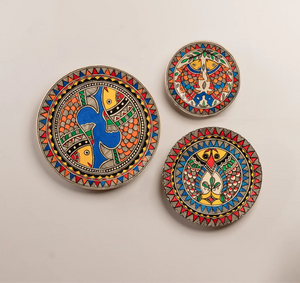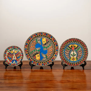 - Hand painted Madhubani Matsya Trinity Décor Plates (set of 3 plates) presents a vivid palette which complements the space with a sense of life.