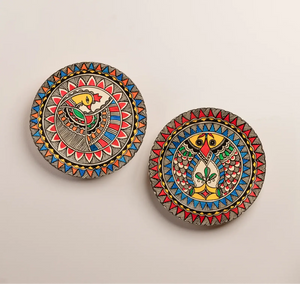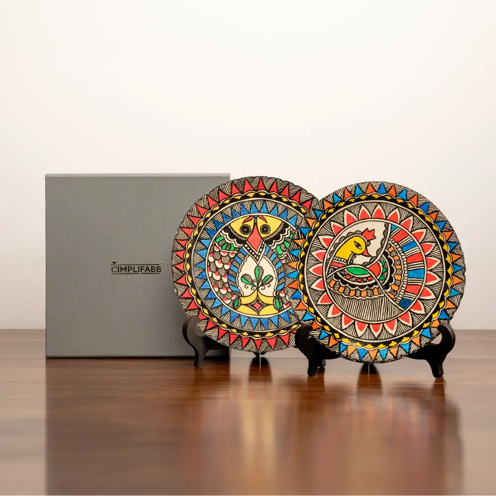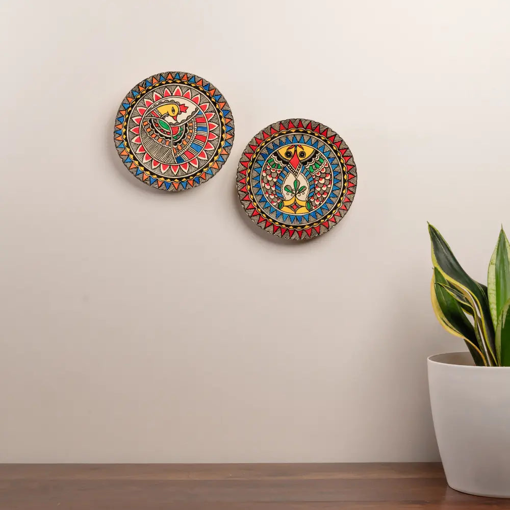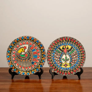 - This set of 2 hand painted Décor Plates depicting the Madhubani Matsya and Mayur (Medium) in striking colors add depth and dimension to the composition creating a stunning visual treat to the eyes.
