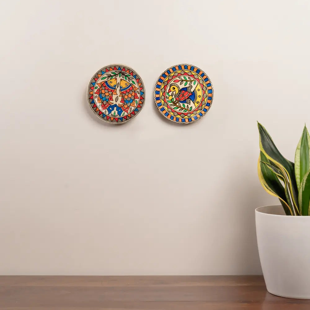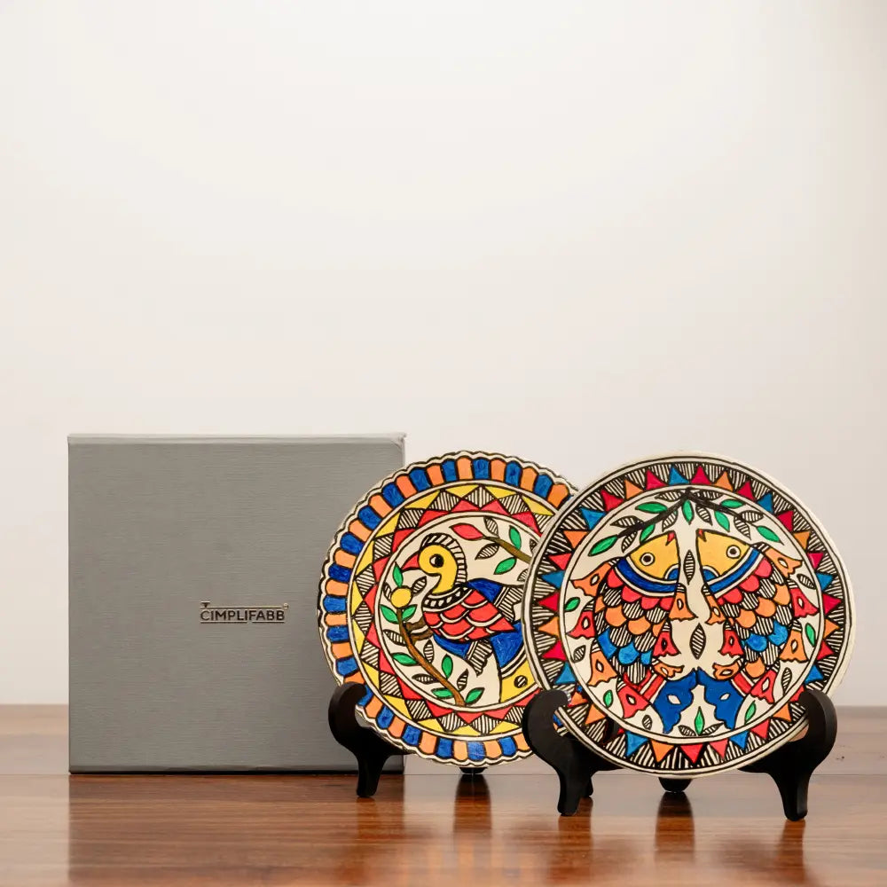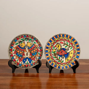 - A collection of 2 hand crafted Madhubani Matsya & Mayur Décor Plates (Small), intricately painted in a hue of colors and designed to achieve a lively aura for your interiors.